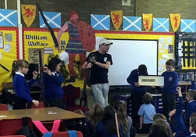 Gary was treated to not only the kids telling him of Wallace's exploits but also a fashion show! Think he had as much fun as the kids, the class were awarded certificates from the society and Wallace coins for the pupils who had made a specific contribution to the poem. Special thanks to George for organising the certificates at short notice. Big thanks to Gary's wife Irene for the photos, and a big thank you to Erica and her class for welcoming us and showing us that Scottish history is alive and well in our schools, the kids knowledge would put a lot of us to shame! |