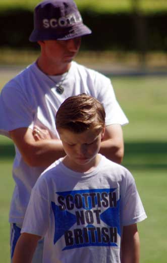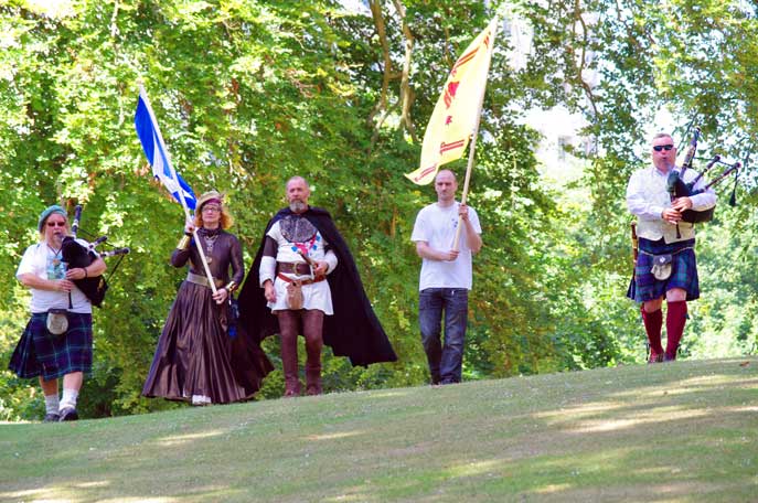 Second speaker was Gordon Aitken with a tribute to Lachlan spoken from the heart. The pipes and drums of the Uphall Station Pipe Band then gave us a medley of tunes, after which wreaths and tributes were placed at the foot of the cairn. A particularly poignant moment came as two women and children who claim descent from Sir John de Graeme knelt and touched the sword/cross before laying their tributes to the fallen.