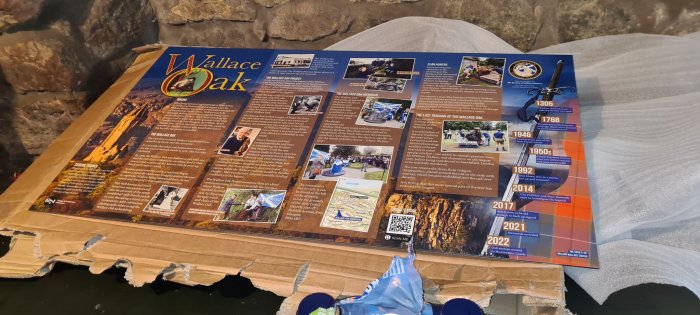George & Gordon laid two wooden pallets on top of each other and cut a sheet of plywood to size and fixed these all together to make a sturdy base. They then cut a large piece of astroturf kindly donated by George’s brother and fitted it around the base. We all then once again got around the Oak before lifting it one last time onto its permanent base. George cut and painted a few wooden wedges to secure the Oak and make it stable. Stuart and Neil brought in the display stand George had made the week before and he attached the newly updated information board to it. After a quick brush up I carefully painted the Wallace Oak chain in its trademark red. George had brought along his replica Wallace Sword and the Society Wallace Shield so these were placed around the oak and everyone gathered around for some pictures.
