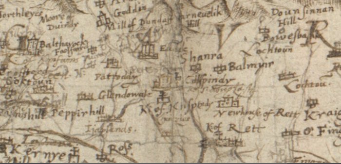 | A copy of Timothy Pont's map of the area, dating from 1583-96, the oldest known accurate map of this area. The castle is central, marked as 'Cillfpindy', just above the church marked 'Kilfpindy'.