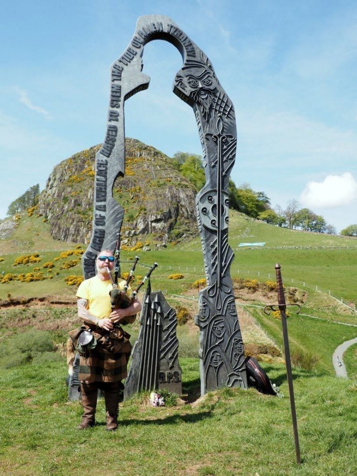 Arriving in the car park half an hour before the Loudoun Hill commemoration was due to start, I was surprised and happy to see that it was already half full. The patriots were gathering early to attend this double commemoration and it was a fine day for it. At a little after 1 p.m. Dougie Wilkinson of Clann an Drumma piped the procession down to the Spirit of Scotland sculpture with banners flying.