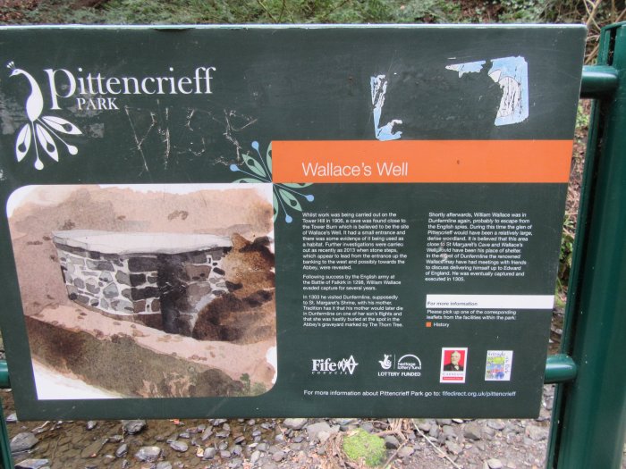 Following success by the English army at the Battle of Falkirk in 1298, William Wallace evaded capture for several years. In 1303 he visited Dunfermline, supposedly to St. Margaret's Shrine, with his mother. Tradition has it that his mother would later die in Dunfermline on one of her son's flights and that she was hastily buried at the spot in the Abbey's graveyard marked by The Thorn Tree. During this time the glen of Pittencrieff would have been a relatively large, dense woodland. It is believed that this area close to St Margaret's Cave and Wallace's Well would have been his place of shelter.