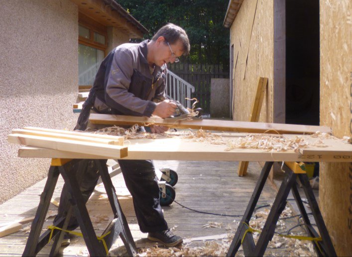 When the Wallace Chair was first mentioned my ears pricked up. I thought I was the very man for the job and ultimately I was honoured to be asked to make it. The initial photos we found were pretty poor, but I managed to work out a few details about the way the chair was constructed. It consisted of six important pieces of timber - four round posts and two heavy cross rails. It looked like it was made from oak, and in a pretty poor state of repair, with rot and worm causing a lot of damage. The chair was also covered in a loose leather cover, which hid a lot of the other detail. We made some enquiries and were sent some close up pictures of the chair by its present owner and these helped immensely. From that, I did a rough sketch and it was agreed we would try to make the chair into a two-seater bench from pressure treated softwood. The first problem I had was to do the turnings as close to the ones we saw in the picture. In softwood this proved very difficult as by the time I started to work on the posts, the wood had dried out and was beginning to show signs of splitting. It actually went better than I thought, although I did not do the turnings on a lathe, I used a table saw and finished the grooves off with a rasp. Working with round section timber threw up various problems and I had to come up with a way to make the back strong, comfortable and not too detached from the original design. I also made the chair higher than it looked in the pictures. With time, the original legs would have rotted and been cut to make firm again. They probably lost about four inches over time. I made the bench normal seat height, even though Wallace might have needed it higher due to his extreme size.