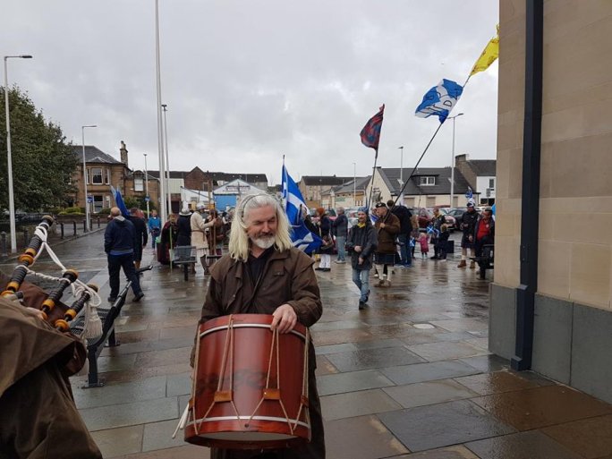 Wallace Day 2017 was dreich, damp and pretty miserable as folk gathered at the square in Johnstone. The turn-out was lower than usual, as it had already been decided to hold the commemoration in the hall rather than at the monument, due to seriously inclement weather. Many folk decided to wait at the hall for the speeches rather than get soaked on the march, but a reasonable number of souls braved the conditions and marched behind Clann an Drumma, all the way to the hall. There was the usual fantastic lineup at the evening event.