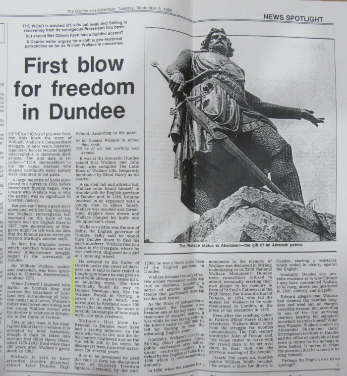 In the wake of the release of the film 'Braveheart' in 1995, the Dundee Courier published an article on September 5th 1995, which outlined Wallace's connections with Dundee, of which more below. It mentions his meeting with John Blair at school, whose writings about Wallace, sadly since lost, are mentioned by the later poet Blind Harry as his source. The Wallace Stones at Longforgan are described, his attacks on the English garrison at Dundee Castle (later razed by Robert the Bruce) and a charter he granted in the name of King John Balliol in Dundee. As the article points out, this charter was proof he was acting in the name of the then king, and gives the lie to the English charges of treason against a king to whom he was in no way subject. Read the article below (click on the picture to see the article full-sized).
