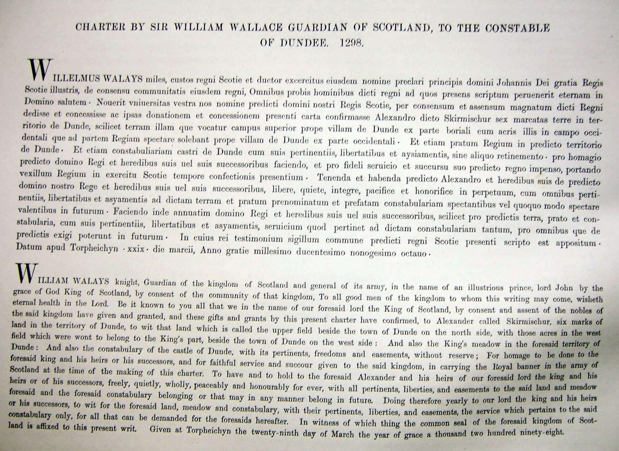 Charter by Sir William Wallace Guardian of Scotland and General of its Army, in the name of King John, granting to Alexander, called Skirmischur, the Constabulary of Dundee, AD 1298